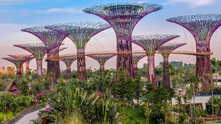 Футуристические сады Сингапура площадью 101 га носят название Gardens by the Bay. В садах несколько оранжерей, которые позволяют познакомиться с самыми разными представителями флоры в мире. Например, есть оранжерея Flower Dome, где поддерживается теплый субтропический климат. Оранжерея Cloud Forest Dome чуть поменьше (0,8 гектар), здесь царствуют влажные экваториальные условия и растут типичные для этой полосы эндемики. Всего, кстати, в обеих оранжереях произрастает 220 тысяч растений. Кроме того, в Gardens by the Bay для туристов создан специальный комплекс из 18 «деревьев» высотой от 25 до 50 метров, самые высокие из которых соединены 128-метровым мостом.