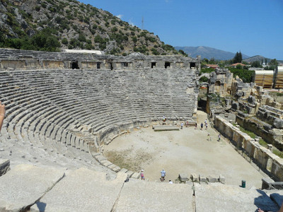 В двух километрах к северу от центра городка лежат руины древней Миры. Добраться до них можно пешком, даже не надо карабкаться высоко в горы. Удобство доступа к сожалению имеет и обратную сторону — туристов, посещающих каждый день Миру, не просто много, а очень много. Поэтому осматривать Миру лучше ранним утром или попозже вечером. Большая часть города все еще погребена под землей, но и то, что лежит на поверхности, стоит осмотреть. Вы увидите большой амфитеатр в римском стиле (в нем иногда даже устраиваются представления), главный некрополь с выдолбленными в скалах могилами, «Речное кладбище», лежащее на склоне горного хребта с прекрасными барельефами. Доступ к руинам открыт ежедневно: с апреля по октябрь — с 8:30 до 19:30, с ноября по март — с 8:30 до 17:00.