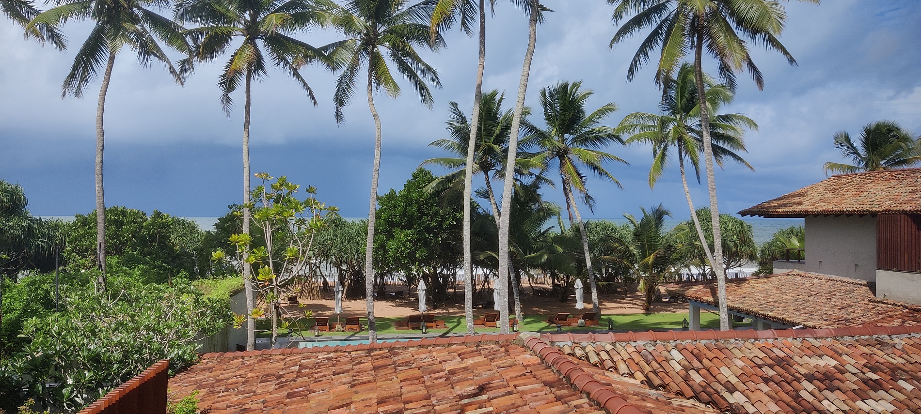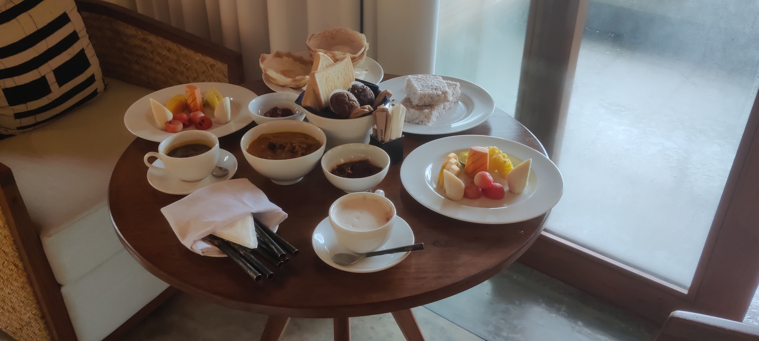 Итак, мы приехали в Villa Thamburu. Нас встретили прохладным лаймовым напитком, быстро оформили и заселили в номер. Это был люкс с видом на море, который обошелся в 633 USD за трое суток. В стоимость входили проживание, ежедневная уборка со сменой белья, завтрак и бассейн с шезлонгами на территории.