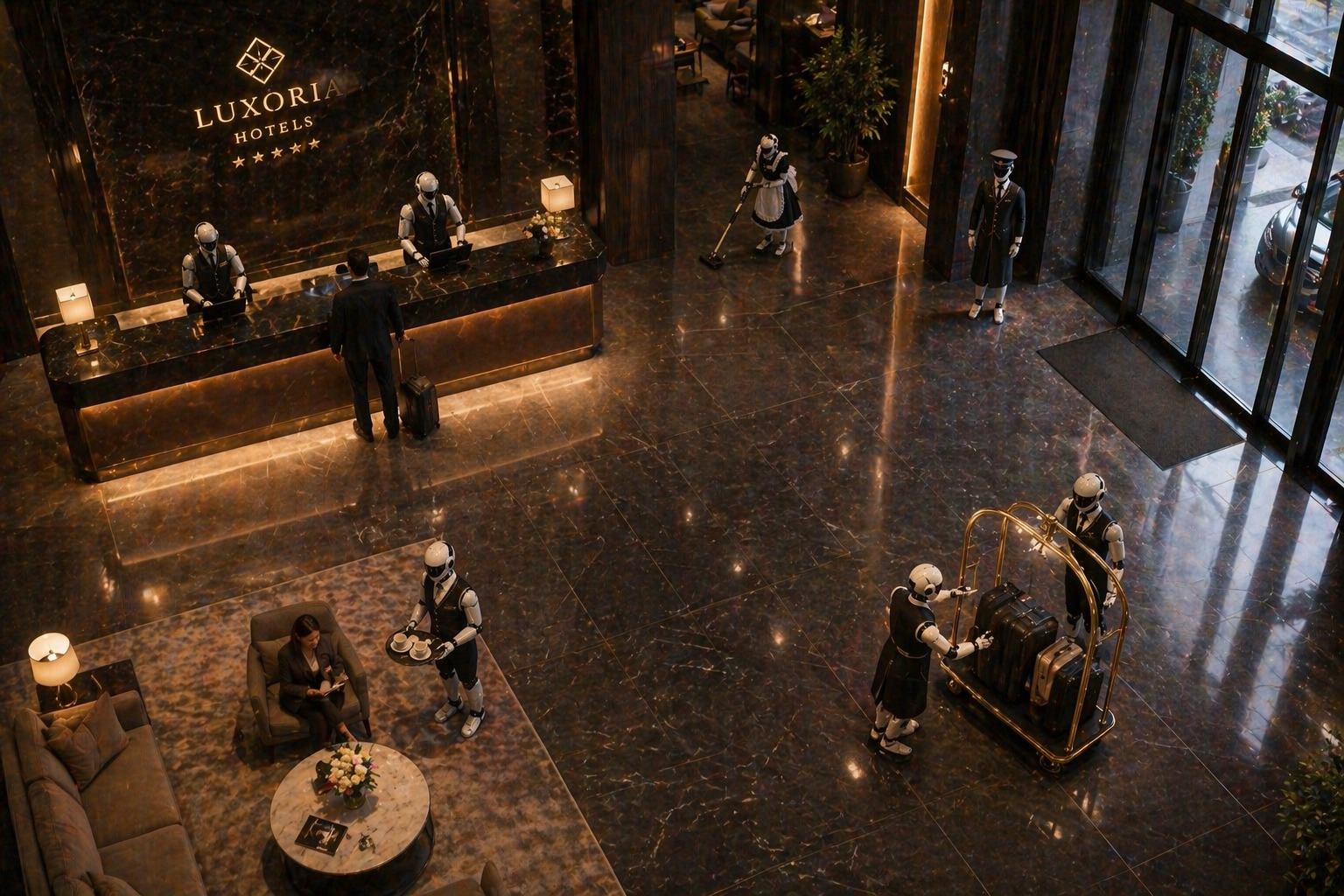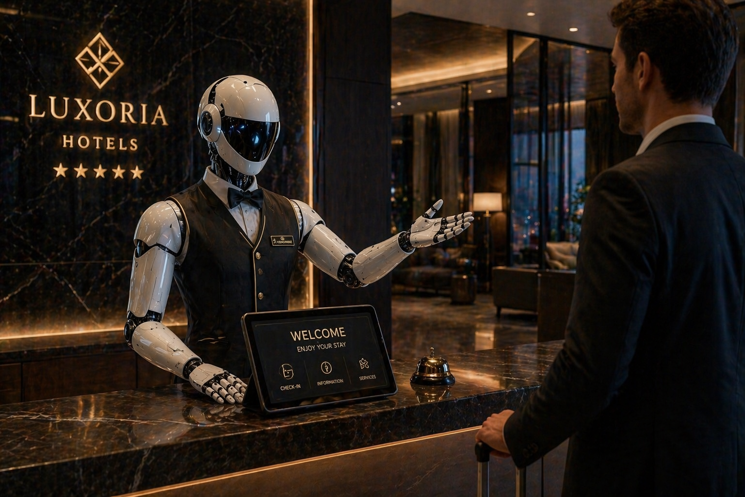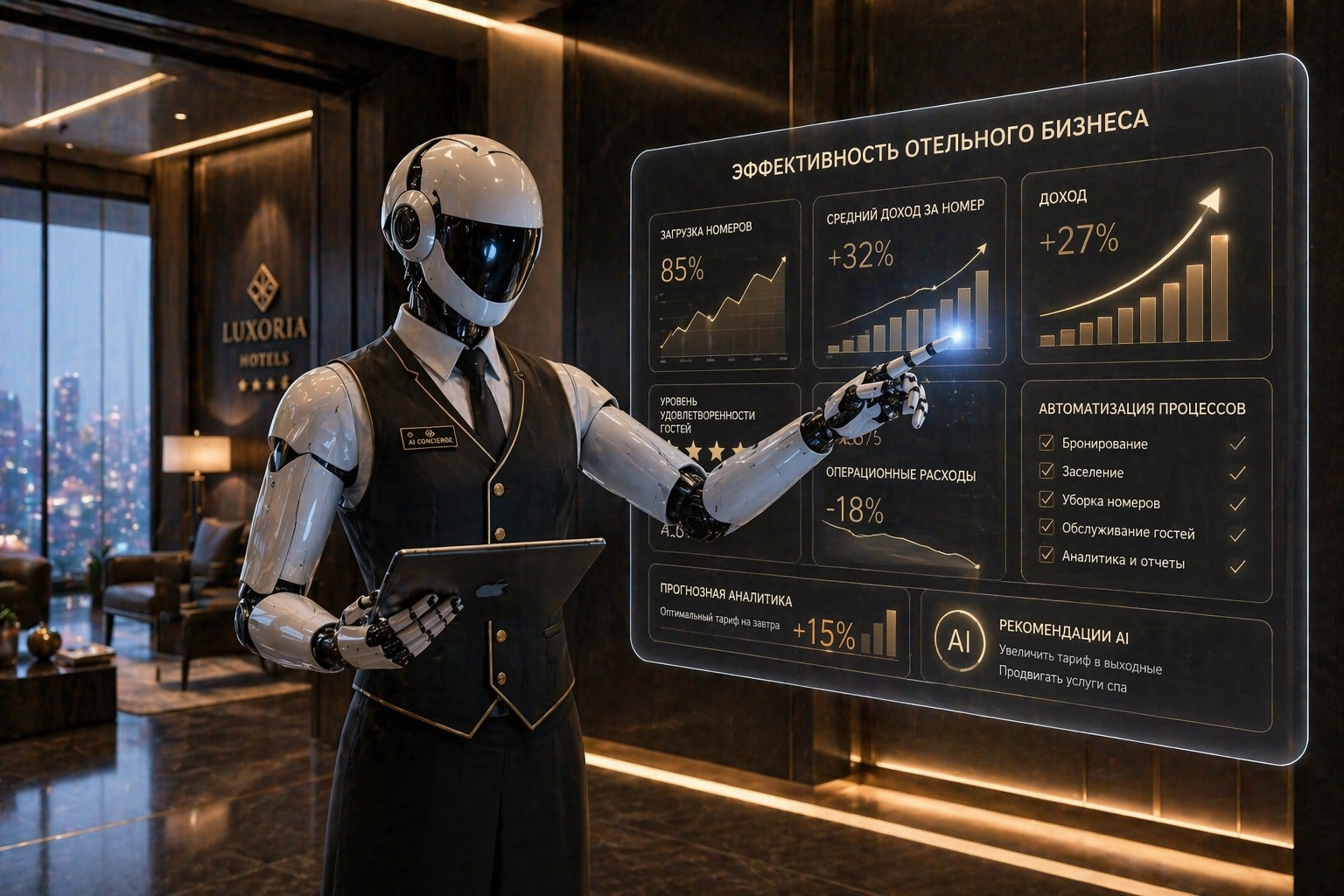 Он знает, какой телеканал гость смотрел в прошлый раз. Знает, какую музыку включить в лифте. Видит по лицу и позе, что перед ним уставший путешественник, и приглушает свет и отправляет ему в номер другого робота с теплым чаем, тем, который гость любит. Помнит все прошлые визиты, аллергии, привычки. Сам отправит миграционные уведомления, сам заплатит налоги и оспорит начисления ресурсоснабжающих организаций. А если кто-то захочет заселиться по СНИЛСу, мягко объяснит, почему это невозможно, и сделает это настолько деликатно, что человек уйдет довольным.