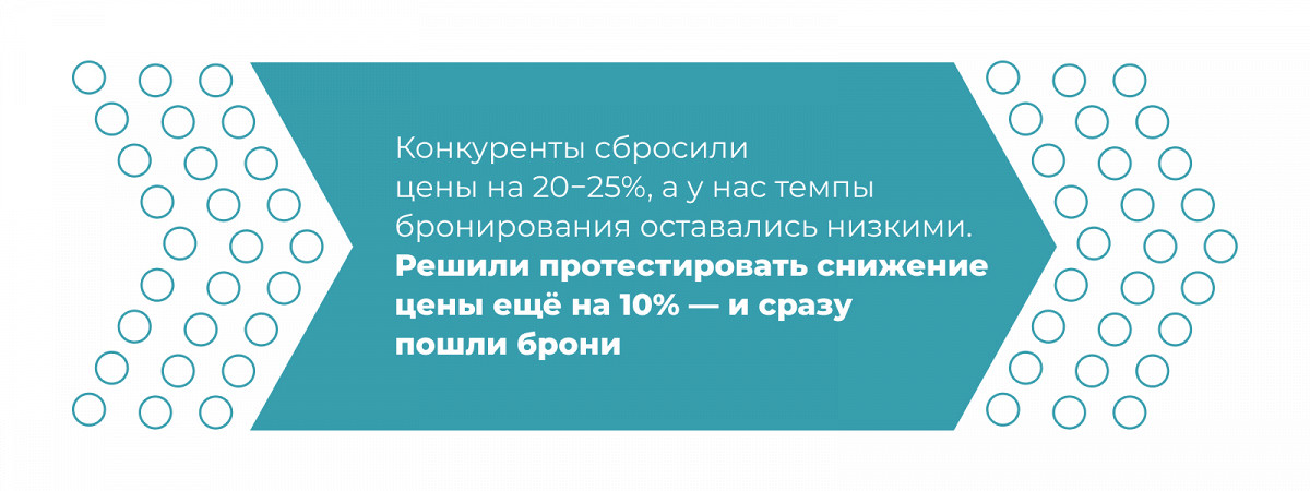 Но в этот раз мы заметили, что конкуренты сбросили цены на 20−25%, а у нас темпы бронирования оставались низкими. Решили протестировать снижение цены ещё на 10% — и сразу пошли брони.