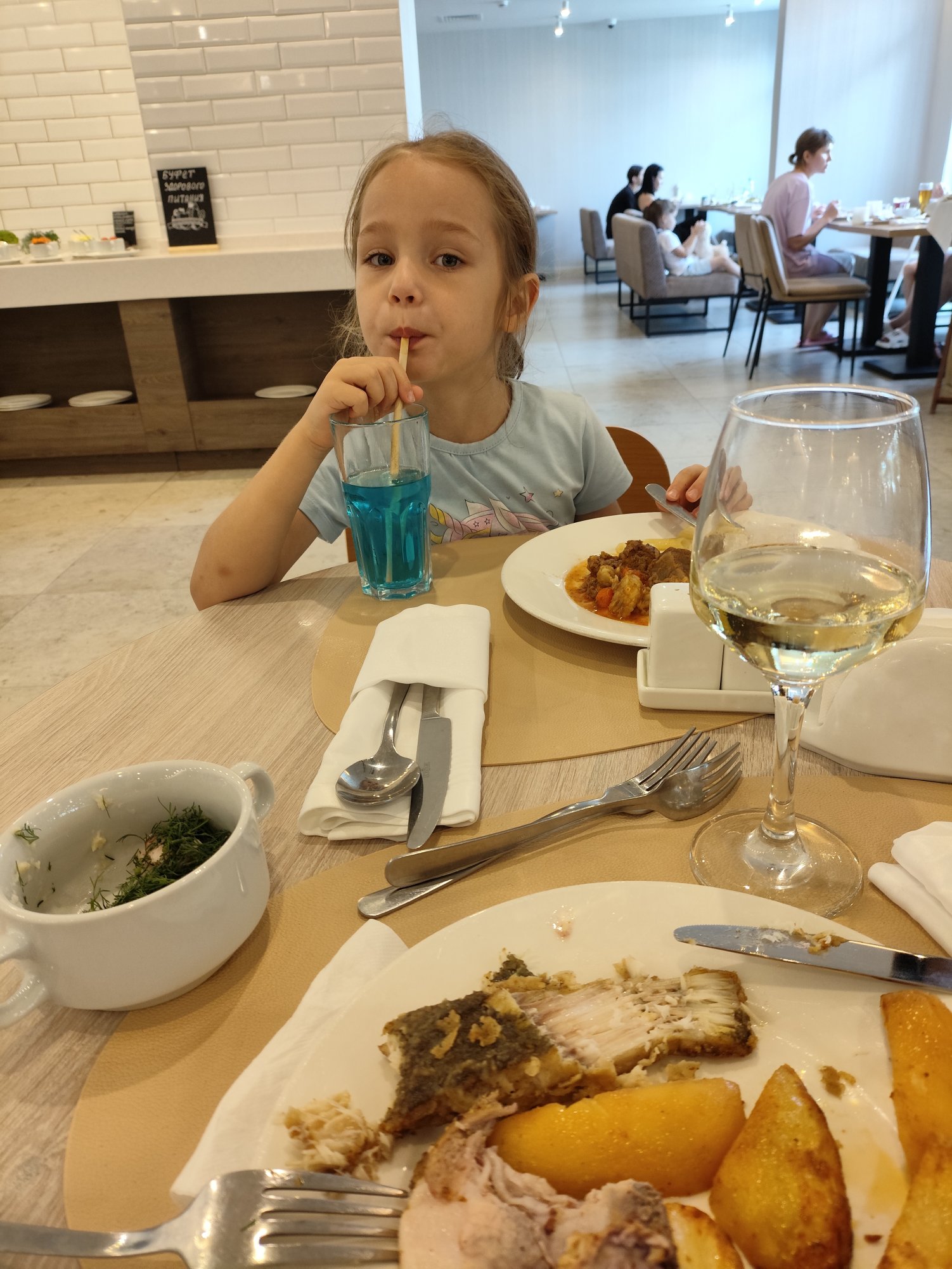 Также на раздаче стоит холодильник с баночным детским питанием и йогуртами. Последние можно брать по 3 штуки в одни руки. В каждом ресторане есть холодильник с бутилированной водой без газа и дополнительно стойки с водой комнатной температуры, морозилка с мороженым и фруктовым льдом. В баре предлагают алкогольные и безалкогольные коктейли, виски, пиво, шампанское и вина местных производителей. Посуда и столовые приборы чистые, без жирного налета. В ресторане все напитки в стеклянных бокалах.