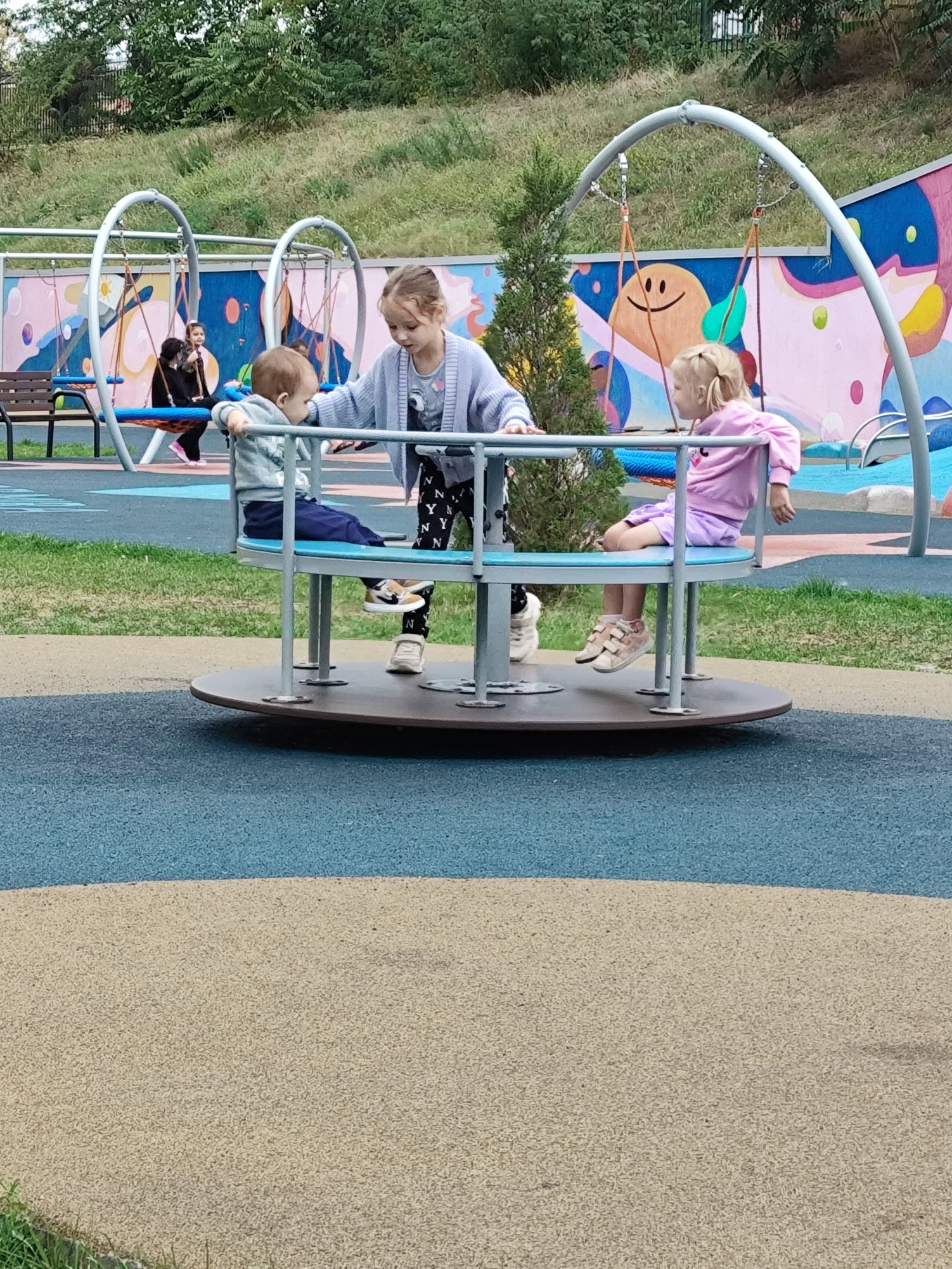 На территории есть шатер. Днем там можно посмотреть фильмы и мультфильмы, а вечером проходит дискотека с веселым ведущим с конкурсами и заданиями. Также открыты 2 детские комнаты. Дополнительно можно подписаться на телеграм-канал отеля, где идет запись на вечерние игры для детей и подростков вроде лазерных стрелялок и твистера. На детской площадке резиновое покрытие по всей площади, яркие граффити, горки, мини-батуты, качели, детский городок, уличные тренажеры, баскетбольный корт. Территория ухоженная, свой спортзал, все функционирует.