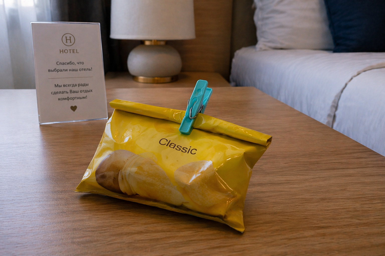 Даже в отеле с обслуживанием «все включено» в номерах время от времени появляются какие-то закуски. С помощью прищепки легко зафиксировать края открытых пакетов с чипсами, орехами или сухофруктами. Это сохранит продукты свежими, не даст им рассыпаться и избавит от риска привлечь нежеланных гостей, например, муравьев.
