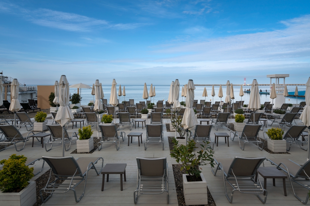 Пляж «Маяк» понравился мне больше всего. Центр города, рядом с морским портом, вода заметно чище, чем на соседних пляжах. Шезлонги с зонтиком — 300 RUB в час или от 1 000 RUB за день. Есть VIP-зона с песчаной насыпью под настилом. Работают пляжные кафе, по вечерам бывает живая музыка, проводятся занятия по сап-серфингу. Из минусов — душевые и туалет недавно стали платными.