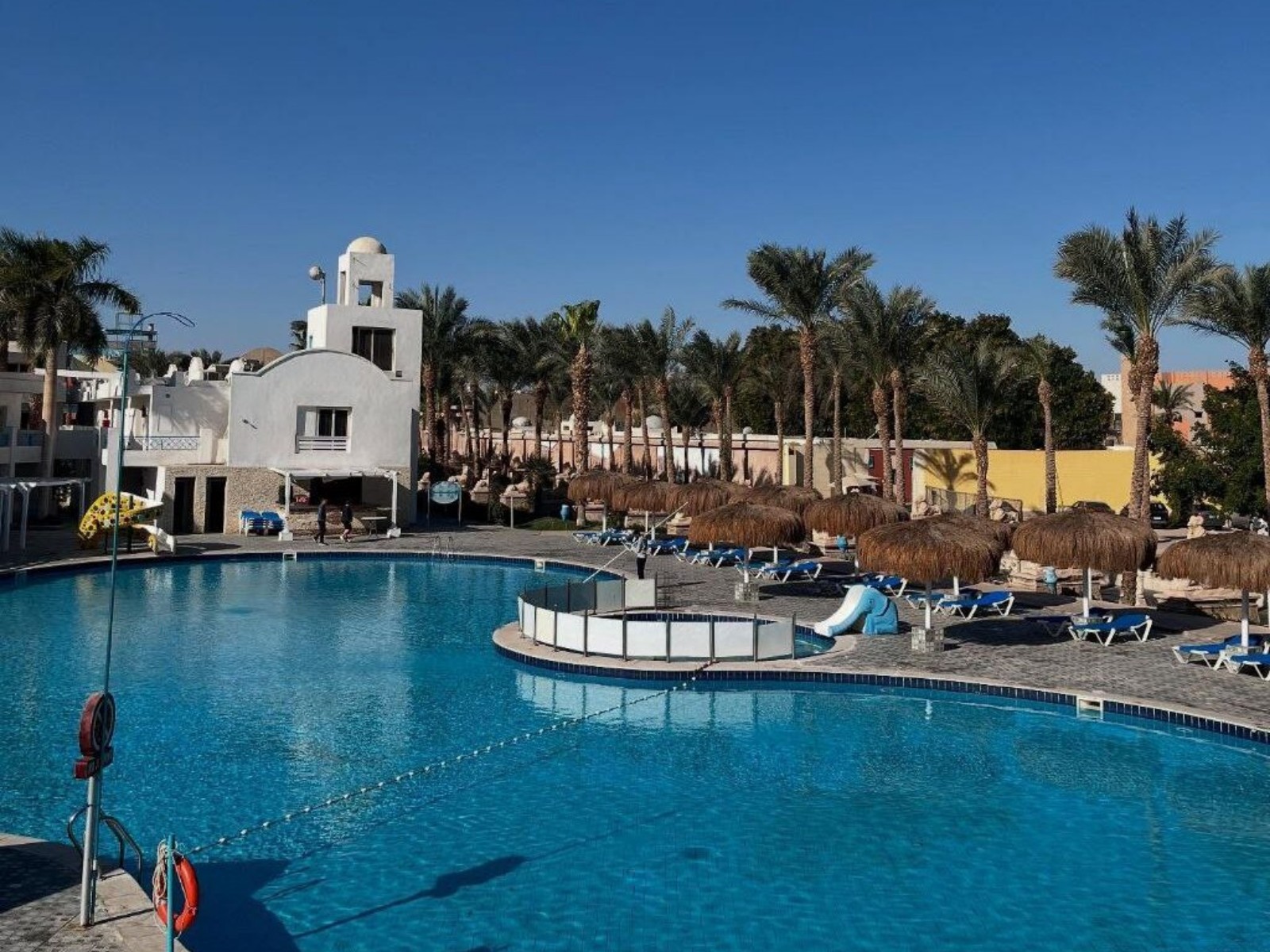 Номер стандартный: 2 кровати (сдвинули в одну), балкон с видом на бассейн, мини-холодильник, телевизор (даже русский канал был), кондиционер. Мебель не новая, но чистая — ковры свежие, постельное белье белоснежное. Убирали каждый день, полотенца меняли, даже лебедей из них крутили. Сантехника — вот тут средне: душ работал, но напор слабый, иногда вода уходила медленно в сливе. Унитаз чистый, ванна без плесени, но плитка старая, местами потрескавшаяся. Никаких тараканов или грязи, как в отзывах — может, нам повезло. В общем, для 4* нормально, мы не привереды.