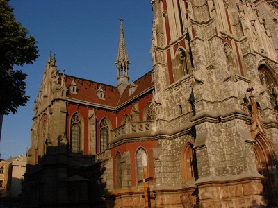ОтзывыОдно из самых красивых сооружений, возведенных в Киеве в начале 20 века, — Николаевский костел. Архитектура костела стилизована под готику — в небо устремляются высокие стрелообразные шпили, фасад украшает традиционная роза, стены насыщены лепным декором.