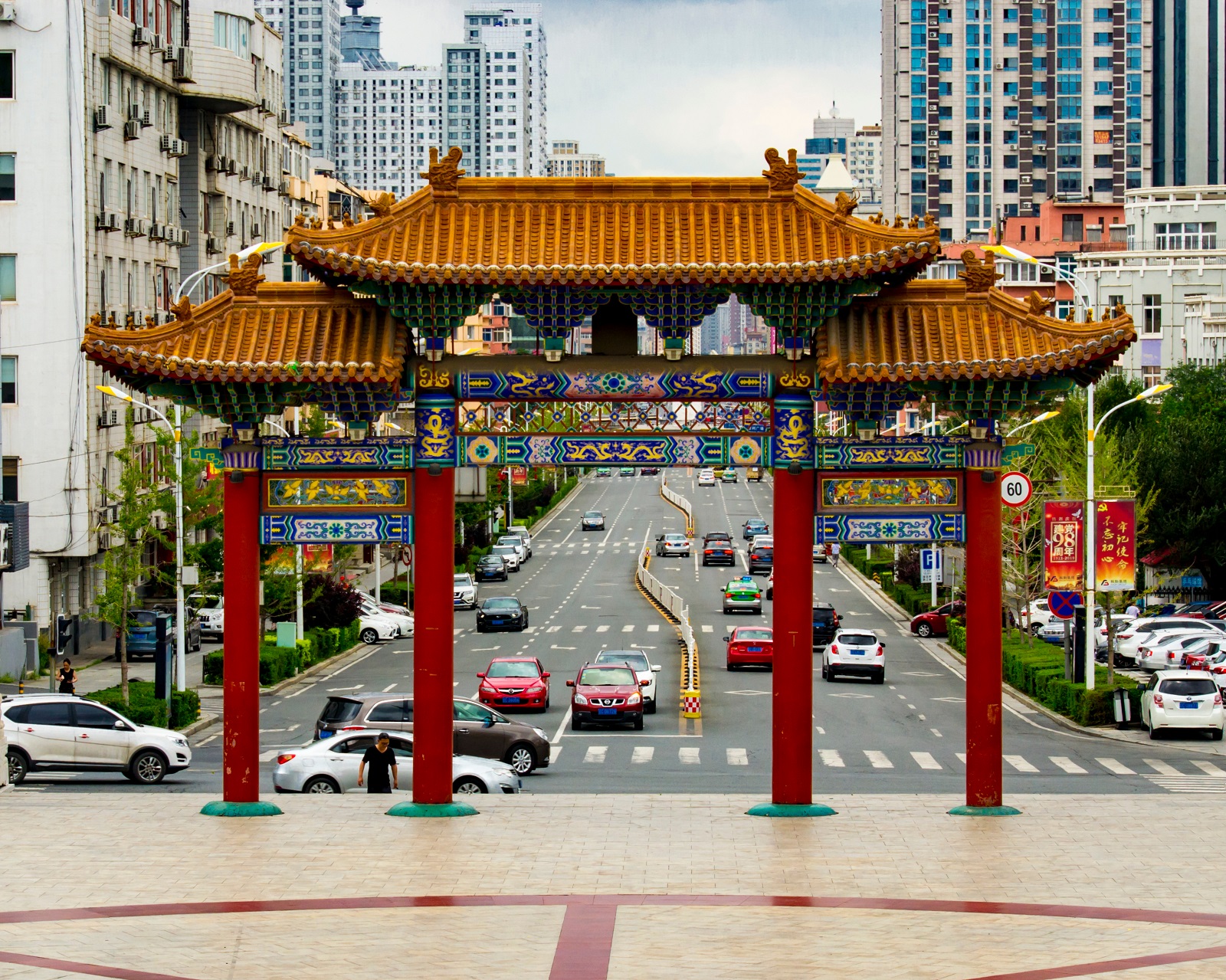 Вид на оживленную городскую улицу через традиционные ворота в китайском стиле. Аньшань Babadym / Shutterstock.com