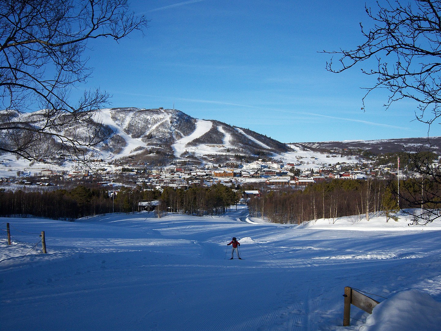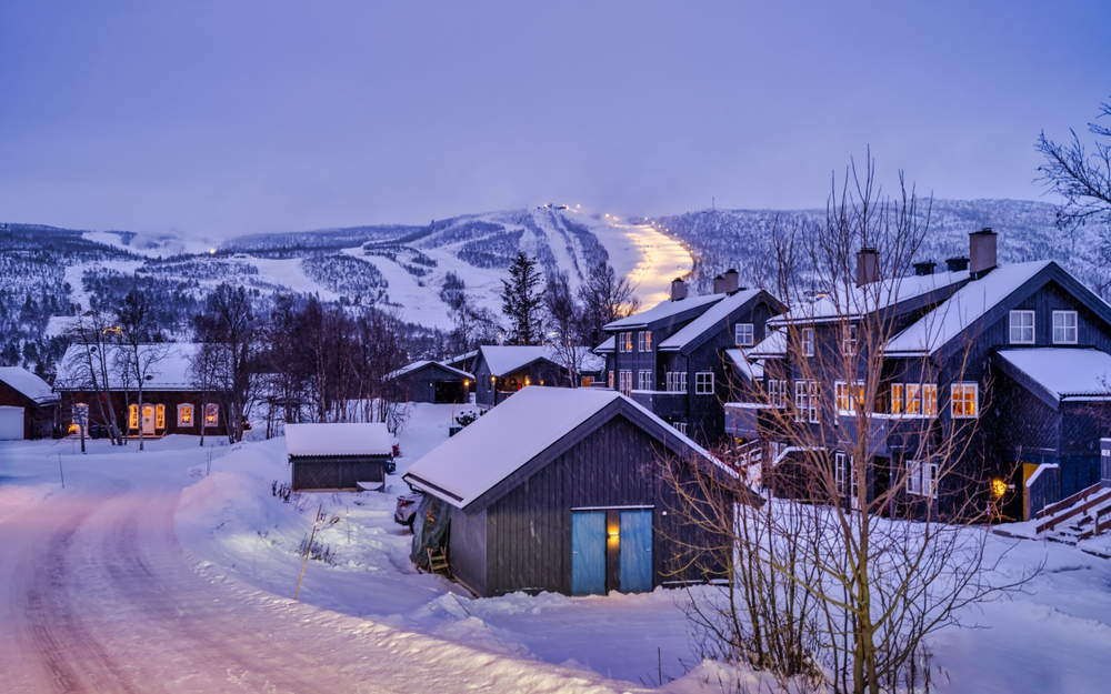 Гейло, Норвегия, деревянные норвежские дома и лыжная трасса на заднем плане
