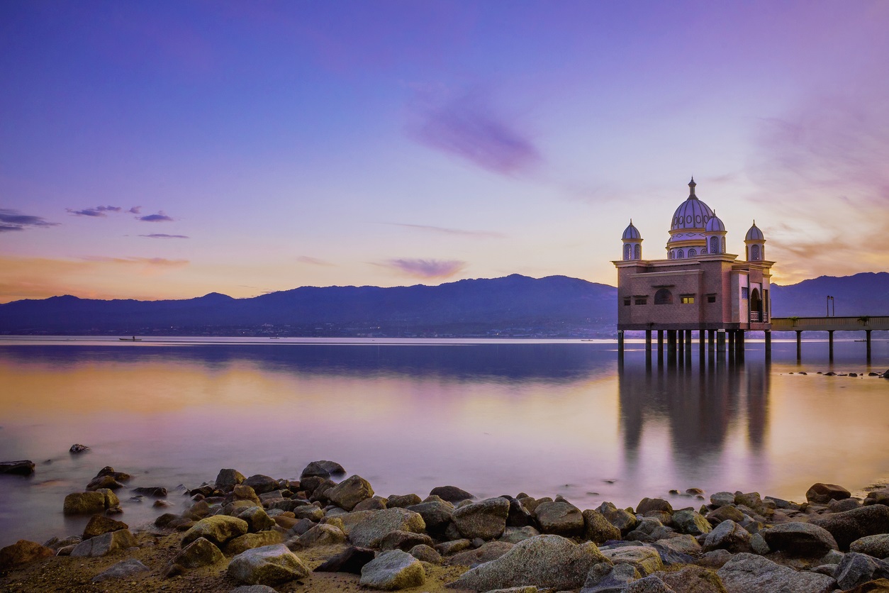 Красивая плавучая мечеть с восходом солнца на заднем плане в городе Палу, Центральный Сулавеси, Индонезия Ridwan Saputra, iStock