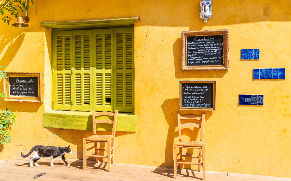 Кальви, Франция, кошка и стулья перед традиционным рестораном в порту Кальви Pawel KazmierczakВопросы о Франции