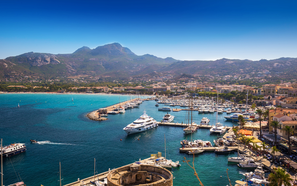 Кальви, Франция, исторический центр города Кальви с песчаным пляжем, историческими домами и гаванью с лодками и яхтами