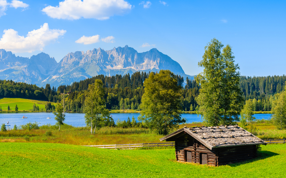 Кирхберг, Австрия, еревянная хижина на зеленом лугу на фоне Альп возле озера Шварцзее
