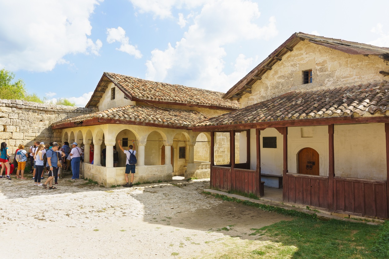Туристы, посещающие караимскую кенеза XVI и XVIII века в средневековом городе-крепости Чуфут-Кале Natalia Garmasheva, iStock