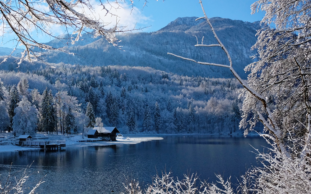 Бохинь, Словения, зимнее утро на озере Бохинь в национальном парке Триглав