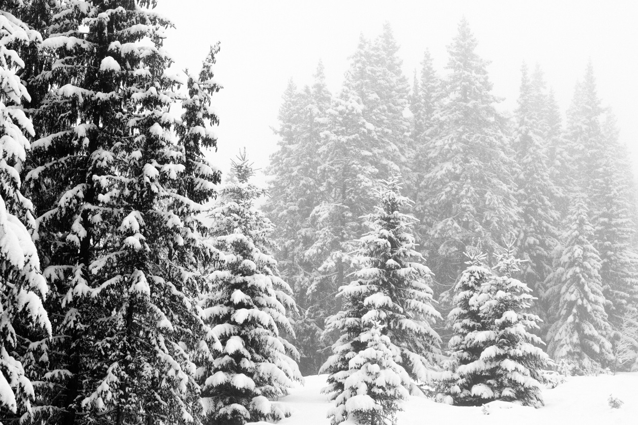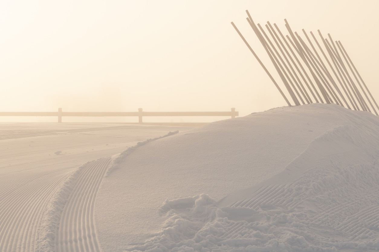 Снежные деревья вдоль горнолыжного склона на горнолыжном курорте Хафьель в Норвегии в пасмурный день со снегопадом silkfactory, iStock