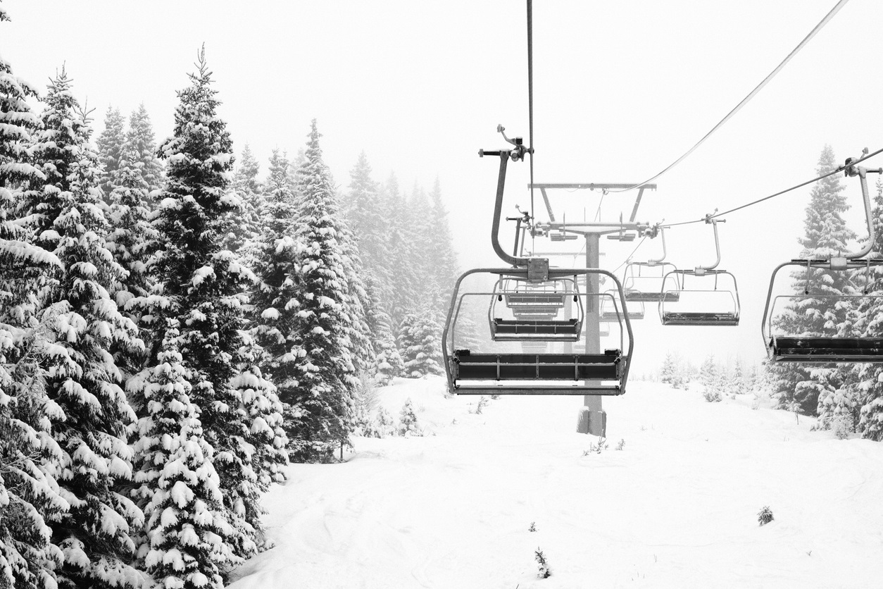 Заснеженные ели и подъемник вдоль горнолыжного склона на горнолыжном курорте Хафьель в Норвегии в пасмурный день со снегопадом silkfactory, iStock